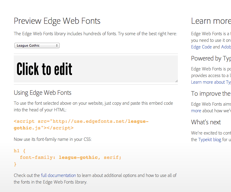 Una vez nos hayamos decidido por la fuente a utilizar es necesario seleccionarla en el menú desplegable de previsualización disponible en la página principal de Edge Web Fonts. Justo debajo de la vista previa de la fuente elegida, en «Using Edge Web Fonts» podremos encontrar el código que deberemos utilizar en nuestro proyecto. Se nos muestra el enlace al script de la fuente así como el código CSS necesario para sustituir en nuestro trabajo. En cualquier caso también nos da la opción de visualizar la documentación completa mediante un enlace.